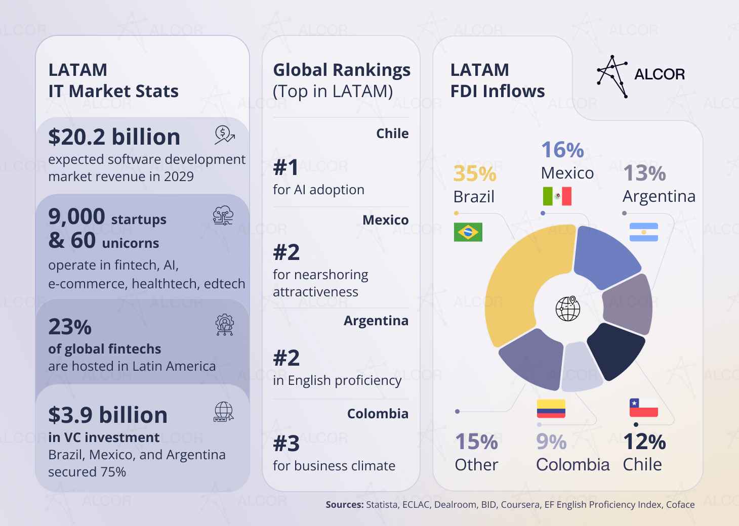1. Backed by $184.3 billion in FDI and rapid tech adoption, LATAM is emerging as a true innovation hub. 9,000 startups and 60 unicorns are fueling the IT market to hit $59.7 billion in 2025.